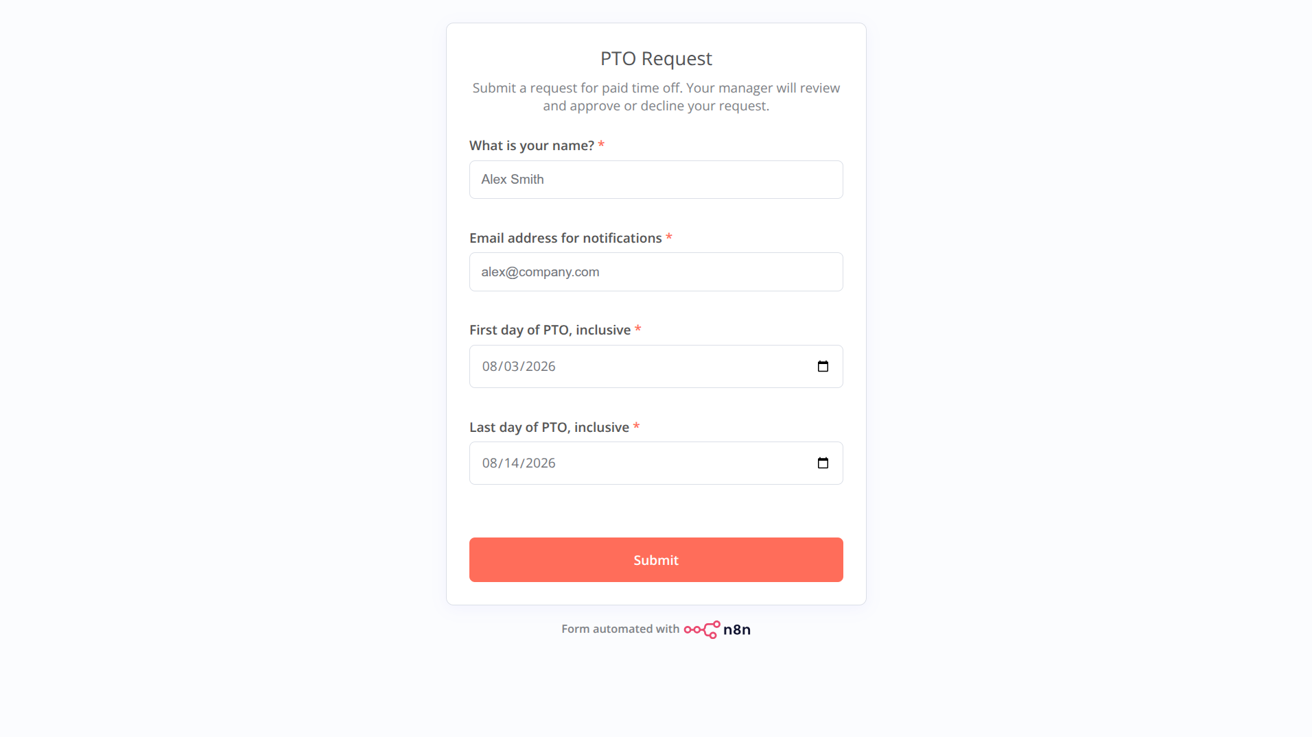 As an employee, you simply fill out a form by selecting the start and end date for your TimeOFF request. Think of TimeOFF as your personal assistant, handling all notifications and communication across the company, while you focus on your daily work and your time off request is managed in the background.